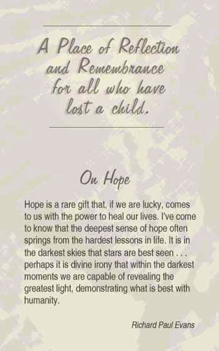 There were several hundred people present for the Grand Opening and Candlelight Ceremony on December 6th, 2008. This will also be a candlelight memorial service for parents who have lost a child, of any age, for any reason. This annual memorial service is an opportunity for parents and friends to gather to remember these children who have left our lives too soon. Program scheduled rain or shine.